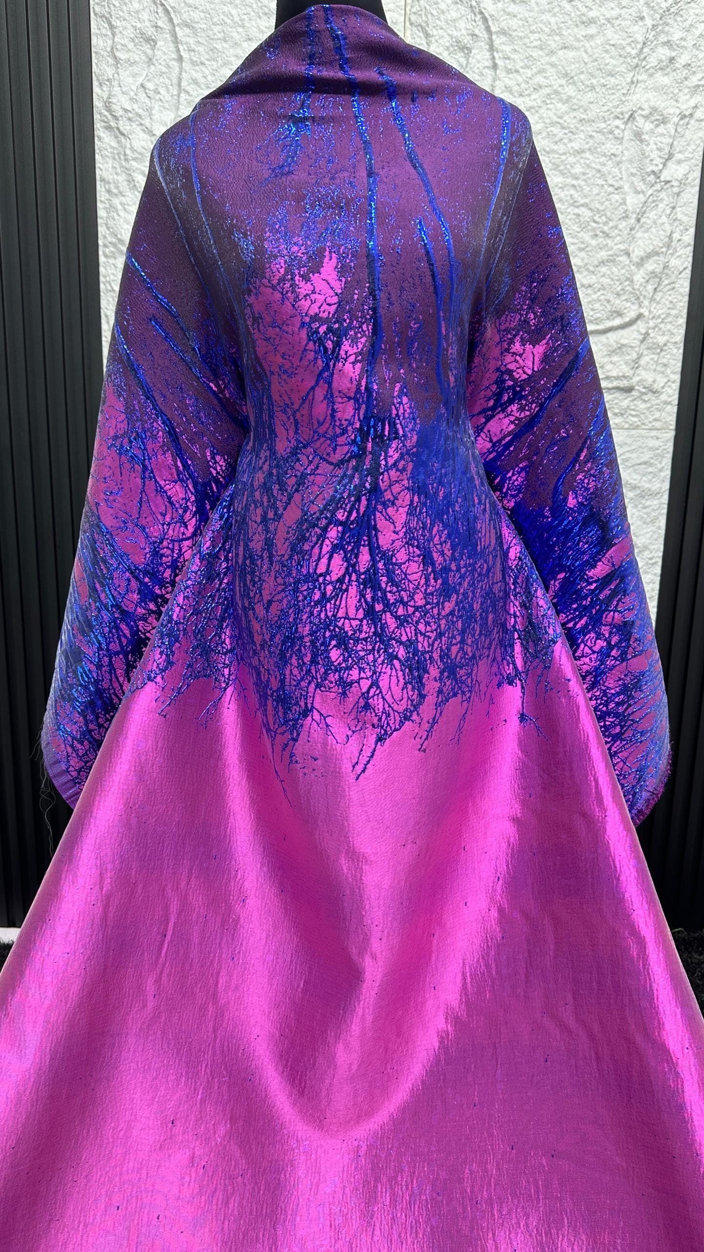 These premium materials feature a captivating hand-painted splash design in vibrant shades—spanning bold purples, pinks, blues, greens, and golds—accented with shimmering metallic threads for a stunning effect.